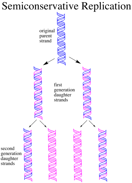 DNA replication is described as semi-conservative because in replication, one strand is conserved, and one new strand is created.