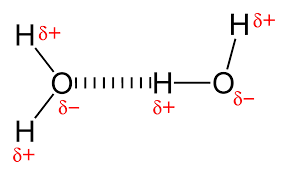 Water is a dipolar molecule, meaning it has an unevenly distributed charge due to the fact that the oxygen atom is slightly negative, and the hydrogen atoms are slightly positive. The delta (δ) symbol indicates slightly positive/negative on the diagram below.