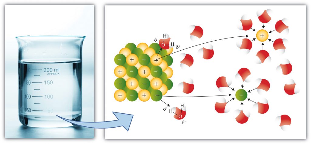 Water is a good solvent, meaning many substances dissolve in it. Polar or charged molecules dissolve readily in water due to the fact that water is dipolar. As can be seen in the diagram below, the slight positive charge on hydrogen atoms will attract any negative solutes, and the slight negative charge on the oxygen atoms of water will attract any positive ions in solutes. These polar molecules are often described as hydrophilic, meaning they are attracted to water.