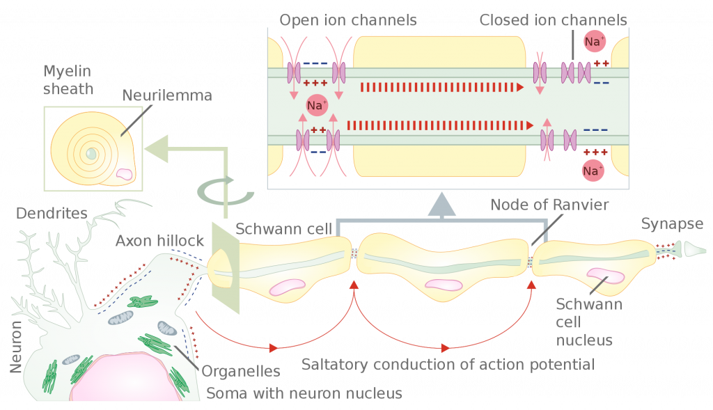 This will occur along the entire axon in a non-myelinated neuron, whereas it is much quicker in myelinated axons. Action potentials can only occur at the nodes of Ranvier, where there is no myelin insulating. Therefore, the localized action potentials will jump from node to node and travel much quicker. This is known as saltatory conduction.