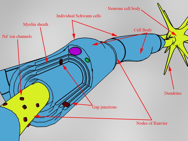 Schwann cells wrap around the axon to form the myelin sheath, which is a lipid and therefore does not allow charged ions or the impulse to pass through it. There are gaps between these myelin sheaths, called nodes of Ranvier.