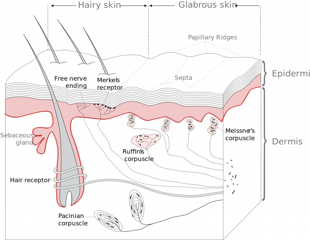 Each receptor responds only to specific stimuli, and this stimulation of a receptor leads to the establishment of a generator potential, which can cause a response. The Pacinian corpuscle responds to pressure changes. These receptors occur deep in the skin, mainly in fingers and feet. It consists of a single sensory neuron wrapped with layers of tissue separated by gel. Plasma membranes contain channel proteins that allow ion transportation. The membranes surrounding the sensory neuron have stretch-mediated sodium channels. In the resting state, Na+ channels are too narrow for Na+ to diffuse, therefore resting potential is maintained. When pressure is applied, it deforms the membrane, stretches and widens the Na+ channels so Na+ diffuses in, which leads to the establishment of a generator potential.