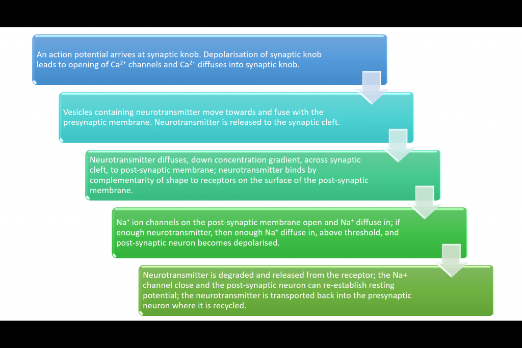 Synapses are the gaps between the end of the axon of one neuron and the dendrite of another one. Here the action potential is transmitted as neurotransmitters that diffuse across the synapse. This process occurs as follows: