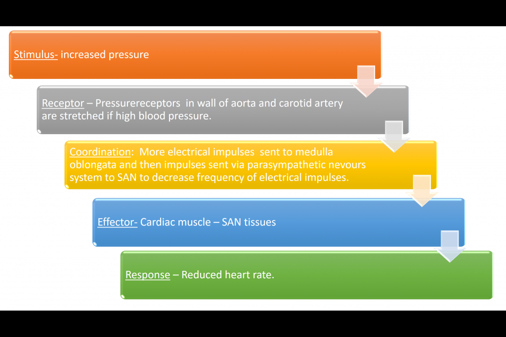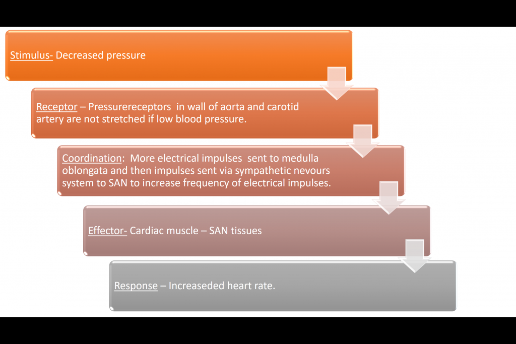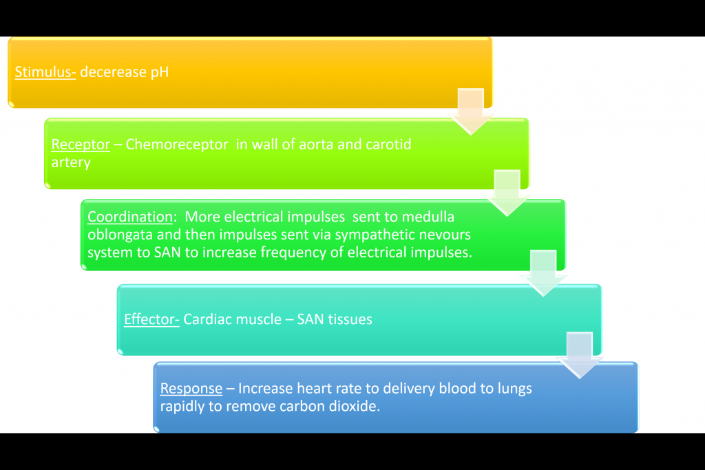 The heart rate changes in response to pH and blood pressure, and these stimuli are detected by chemoreceptors and pressure receptors in the aorta and carotid artery.