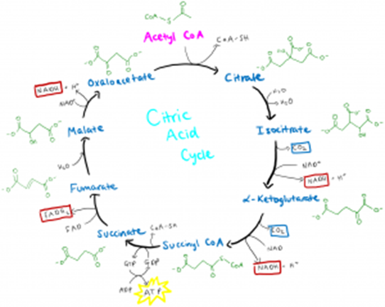 In total, therefore, per glucose molecule, 2 ATP, 6 NADH, and 2 FADH are produced. The Krebs cycle is also known as the citric acid cycle.