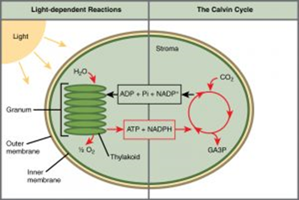 The light-independent reaction is a cycle, the Calvin cycle. It uses carbon dioxide, reduced NADP and ATP to form a hexose sugar. The ATP is hydrolyzed to provide energy for this reaction and the NADPH donates the hydrogen to reduce molecules GP in the cycle.