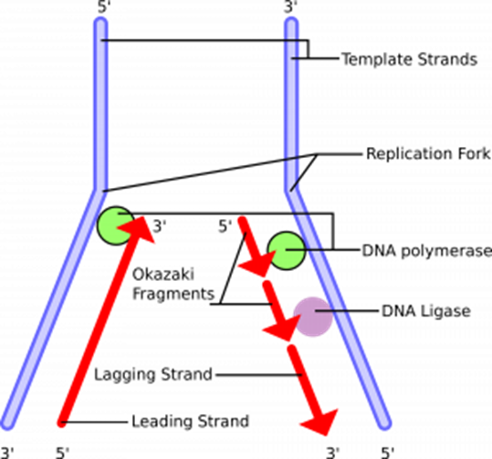 DNA polymerase can only attach at the 3’ end and, therefore, will move along the template strand in the 3’ to 5’ direction. When the enzyme is moving towards the replication fork, the new strand is referred to as the ‘leading strand’ and can be created in one continuous go. On the antiparallel strand, the DNA polymerase still attaches at the 3’ end and works down towards the 5’ end, but this is directly next to the replication fork. Therefore, every time the replication fork unwinds further, the enzyme has to reattach to the 3’ end, and this creates small fragments of DNA. This strand is called the ‘lagging strand’ and the small fragments are called Okazaki fragments. The Okazaki fragments are later joined together by the enzyme DNA ligase.