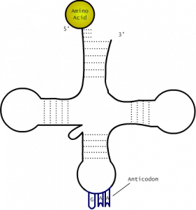 Transfer RNA is found only in the cytoplasm. It is single stranded but folded to create a shape that looks like a cloverleaf. This cloverleaf shape is held in place by hydrogen bonds, demonstrated with the dashed lines in the diagram below. The function of tRNA is to attach to one of the 20 amino acids and transfer this amino acid to the ribosome to create the polypeptide chain. Specific amino acids attach to specific tRNA molecules, and this is determined by 3 bases found on the tRNA which are complementary to the 3 bases on mRNA. These are called the anticodon because they are complementary to the codon on mRNA.