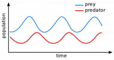 The interaction between predators and prey in a food web is represented in the graph below. Regardless of the species, the graph always follows the same pattern. The size of the predator and prey populations both fluctuate, there will always be more prey than predators, and the size of the population will always change in the prey and then the predators.