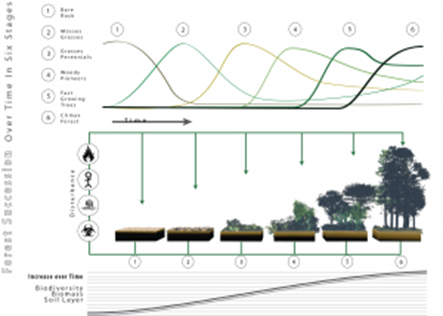 This pattern continues, and as the abiotic factors continue to be less harsh, larger plants can survive and change the environment further. Each new species may change the environment in such a way that it becomes less suitable for the previous species, and they become outcompeted. Changes that organisms produce in their abiotic environment can result in a less hostile environment and increase biodiversity. The final stage in succession is known as the climax community, and this is dominated by trees.