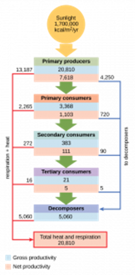Rates of productivity are recorded using the units kJ ha–1 year–1. kJ is the unit for energy, but these units also include per unit area and per year. It is recorded as per unit area to standardize the results to enable environments to be compared - it takes into account that different environments will vary in size. The units are also per year to take into account the impact seasons will have on rain, light, and heat – it provides an annual average to allow fair comparisons between environments.