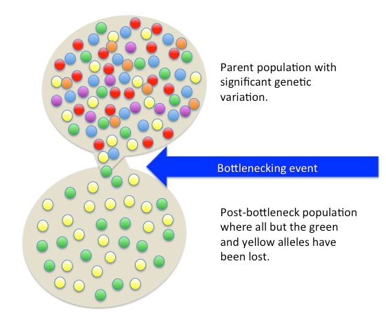 The diagram above illustrates the impact of these processes. Many alleles are lost, and the remaining breeding population passes on the same alleles. This results in a lack of genetic diversity, making genetic diseases present in the population more likely to be inherited.