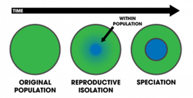 Speciation is the process that results in the creation of new species. This occurs when one original population of the same species becomes reproductively isolated. Reproductive isolation means that there are now two populations of the same species, but they cannot interbreed. This can lead to the accumulation of genetic differences in their gene pools to the extent that the two populations are unable to produce fertile offspring and are thus classified as two different species. Reproductive isolation can occur either geographically (allopatric speciation) or due to changes in reproductive mechanisms (sympatric speciation).
