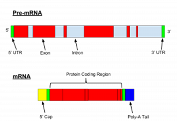The newly synthesized strand of mRNA is called pre-mRNA before it has been modified. The key modifications are the removal of the introns and protective caps added to protect the mRNA against degrading enzymes in the cytoplasm.