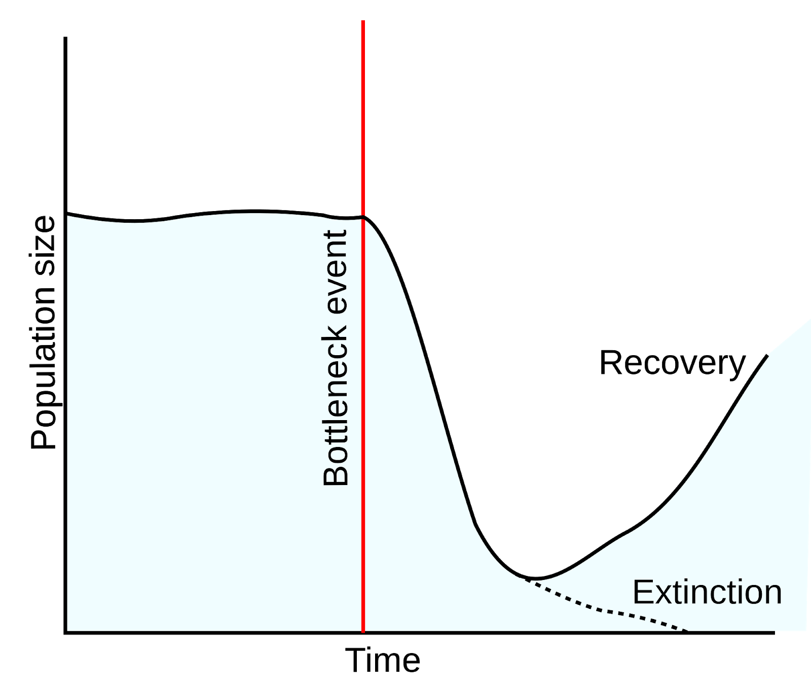 These two processes have different causes but the same impact. Genetic bottlenecks occur when an event kills almost all of a population, leaving only a few individuals alive. As a result, the gene pool becomes very limited.