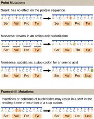 A base substitution may be ‘silent’, meaning that the new codon still codes for the same amino acid. This is because the genetic code is degenerate (multiple codons can code for the same amino acid). Base deletions result in a frameshift. Removal of one base changes all of the subsequent codons, as can be seen above, which is more harmful as multiple amino acids may be incorrectly coded for.