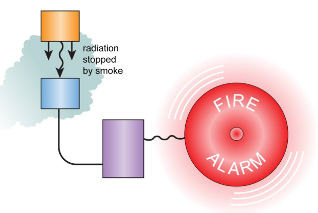 If smoke is present, it absorbs the alpha radiation, meaning current can no longer flow across the gap, triggering the alarm.