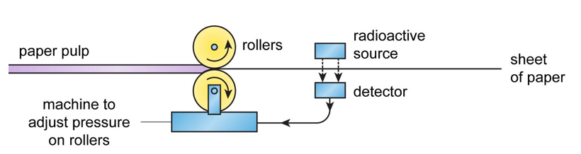 Radioactive sources can be used to measure the thickness of materials that are being rolled out, such as paper or sheet metal. The source is positioned on one side of the material with a detector on the other side. A change in thickness will affect the amount of radiation passing through the material and being received by the detector. This can be used to change the pressure of the rollers to increase/decrease the thickness as necessary.
