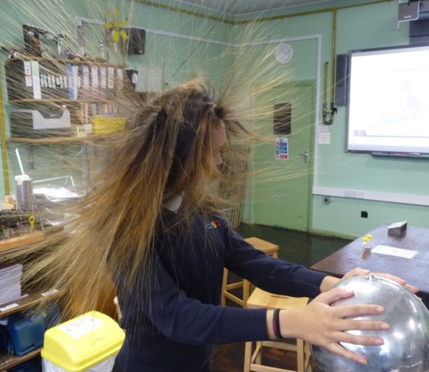 The Van der Graaff generator is a classic demonstration of static electricity. A belt rubs on the inside of a metal sphere, and the friction causes electrons to move onto the sphere. The sphere is supported by a plastic (insulating) stand, and so the electrons build up on the sphere.