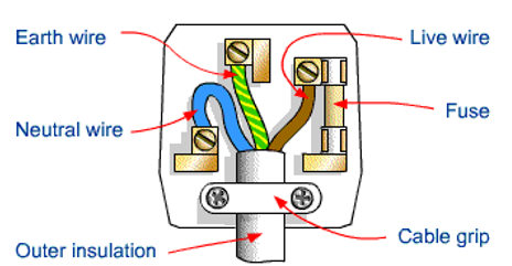The Earth pin is at the top with the live and neutral pins at the bottom. The fuse is connected to the live wire. There is a cable grip to keep the wires in place.