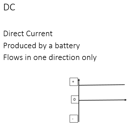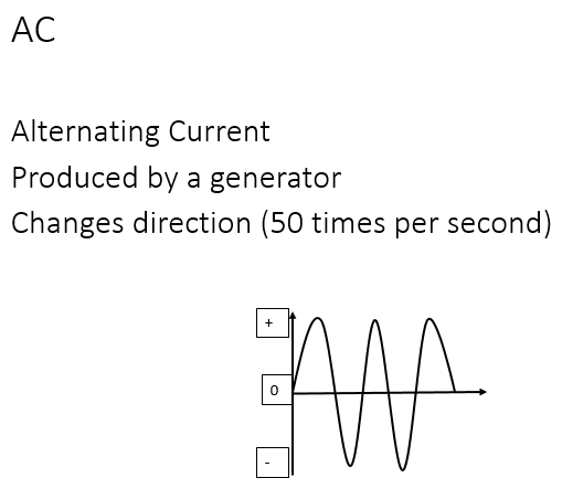 Alternating Current (AC) is produced – this means the direction of the current changes direction repeatedly. In the UK, the mains electrical supply has a frequency of 50Hz – it changes direction 50 times per second.