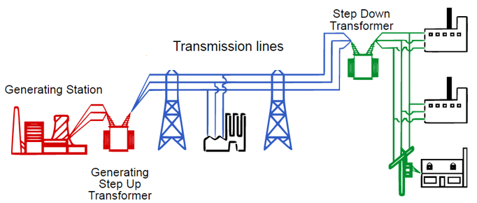 Every power station feeds into the grid and every consumer takes electricity from the grid. Transformers are used to step up voltage from power station to the grid and to step down voltage from the grid to homes (230V).