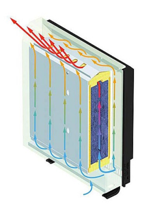 The bricks have a high specific heat capacity so they warm up slowly and then cool down slowly during the day, releasing thermal energy into the room. This is cheaper than using hot water in radiators but offers less control over the temperature of the room.