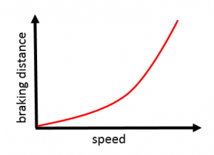 Braking distance increases in a squared relationship with speed. If the speed doubles, the braking distance increases 4 times