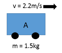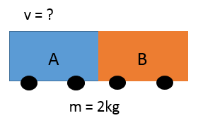 Trolley A has a mass of 1.5kg and is pushed into trolley B at a velocity of 2.2m/s. Trolley B has a mass of 0.5kg and is not moving. After the impact, the trolleys stick together.