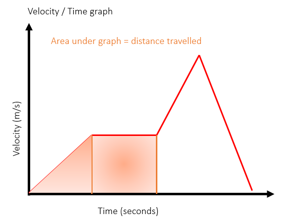 To calculate the distance travelled during a section of a velocity-time graph, calculate the area under that section of the graph.