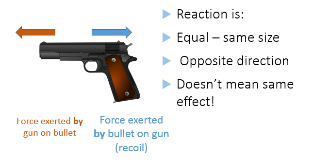 The recoil force on a gun (the gun recoils back to the shooter as the bullet is fired)
