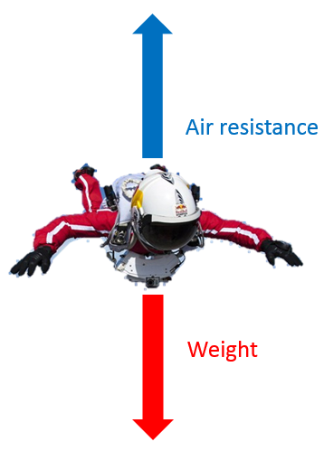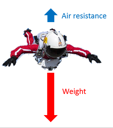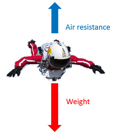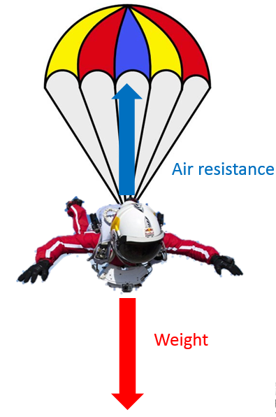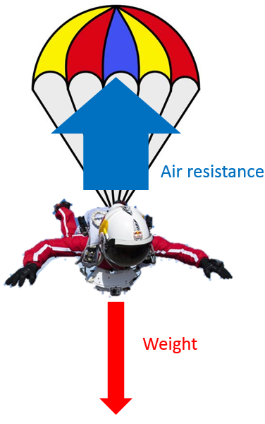Eventually, the air resistance equals the weight. The forces are now balanced, so the skydiver continues falling at a constant speed. This maximum speed is known as terminal velocity.