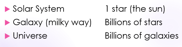 Our solar system is part of a group of billions of stars known as the Milky Way – this is our galaxy. The universe contains billions of galaxies.