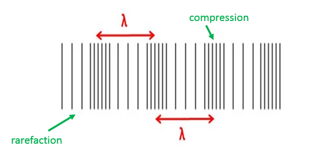 Longitudinal waves have compressions (areas where the particles are closer together) and rarefactions (areas where particles are further apart). The wavelength of a longitudinal wave is the distance from one compression to the next.