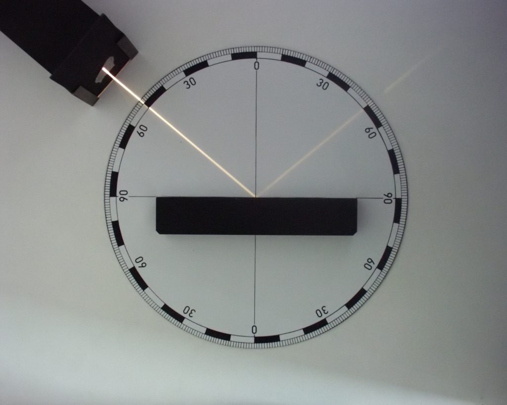 With these light rays drawn, a line should be drawn at 90o to the mirror at the position where the ray was reflected. This is called the ‘normal’. The angle of incidence and angle of reflection can then be measured by using a protractor to measure the angle between the ray and the normal.