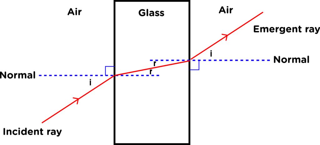 If the ray of light enters the block at 90o to the edge of the block, it will pass through the block without changing direction. If the ray enters the block at an angle, its path will bend towards the normal as it enters the block and away from the normal when it leaves the block. This is known as refraction and occurs because the light changes speed as it travels from one material to another. (This will be explained in the light lesson)