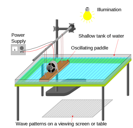 Wave features can be measured using a ripple tank. A motor produces waves (ripples) in a shallow tank of water. The tank has a transparent base and a light above it. This allows the waves to be seen as shadows moving on the surface below the tank.