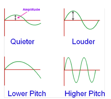 The bigger the amplitude of the wave, the louder the sound. The shorter the wavelength of the wave, the higher pitched the sound. High frequency = high pitch.
