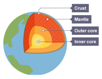 The Earth’s structure can be described as 4 parts: the crust, the mantle (molten rock), a liquid outer core, and a solid inner core.