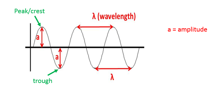 Transverse waves have peaks/crests and troughs. The amplitude of the wave is the distance from the central point to a peak or a trough (the maximum displacement of the wave). The wavelength of the wave (given the symbol λ) is the distance from one peak to the next or from one trough to the next.
